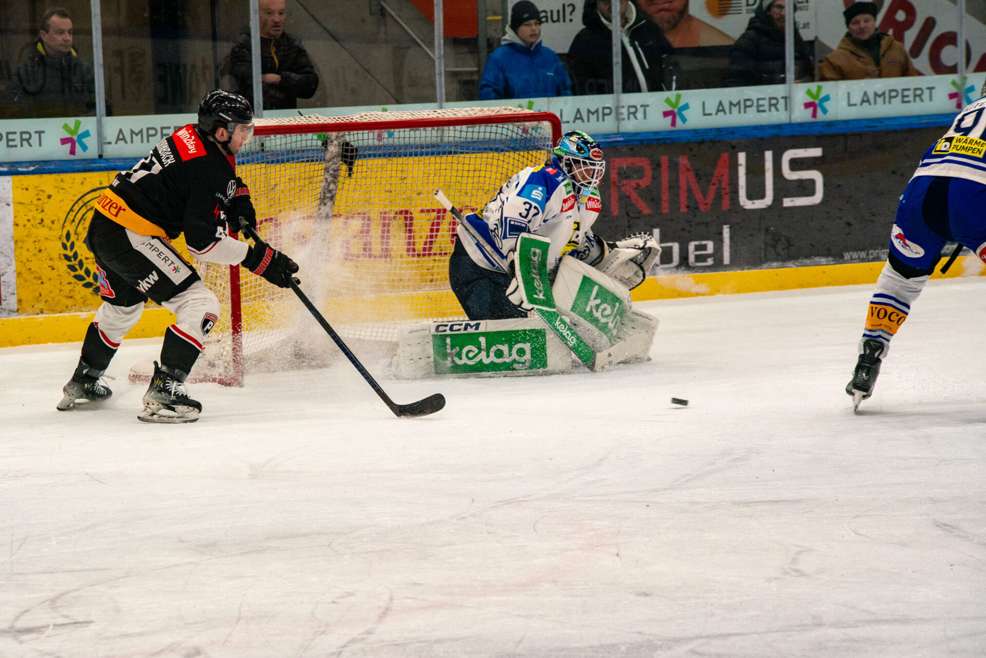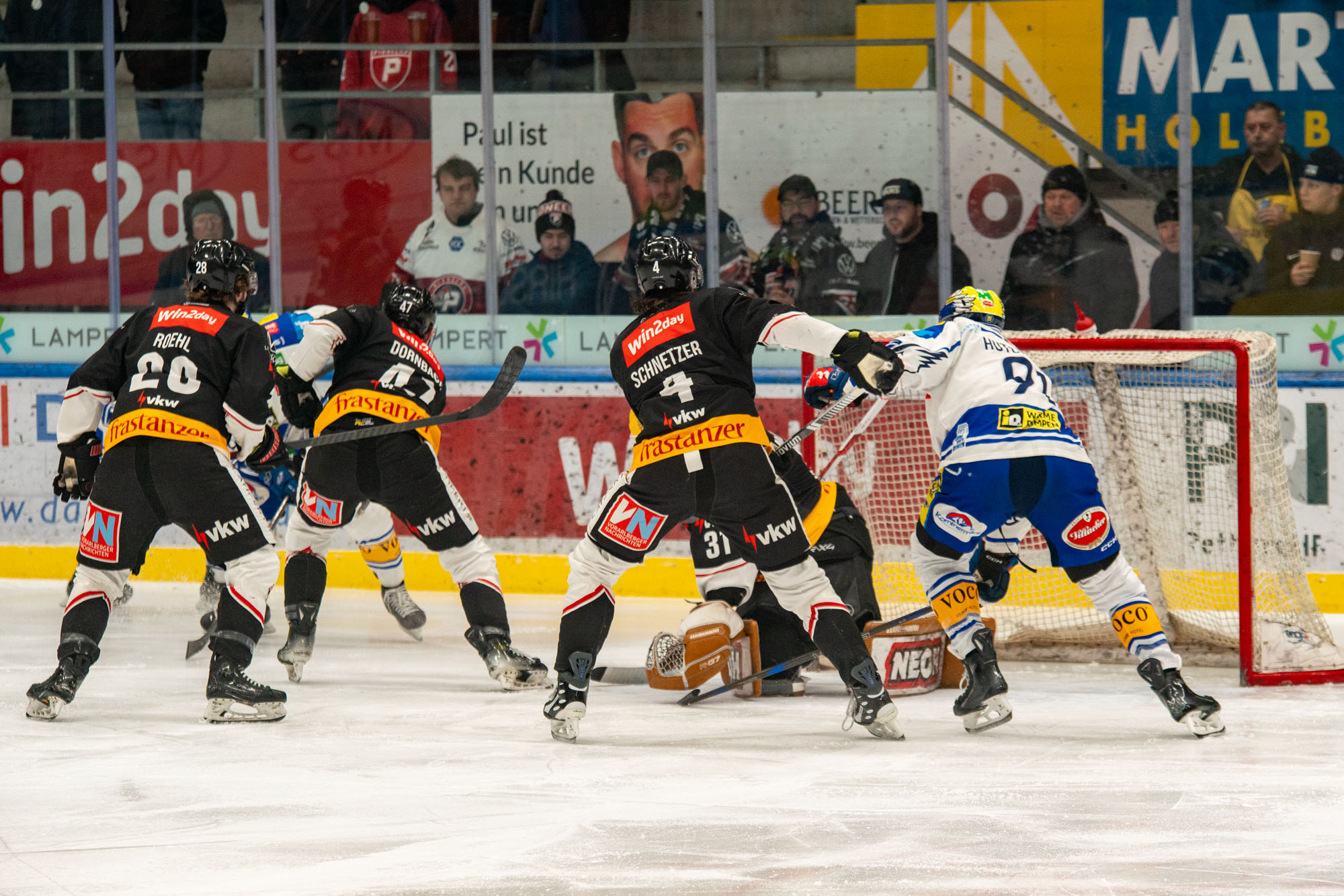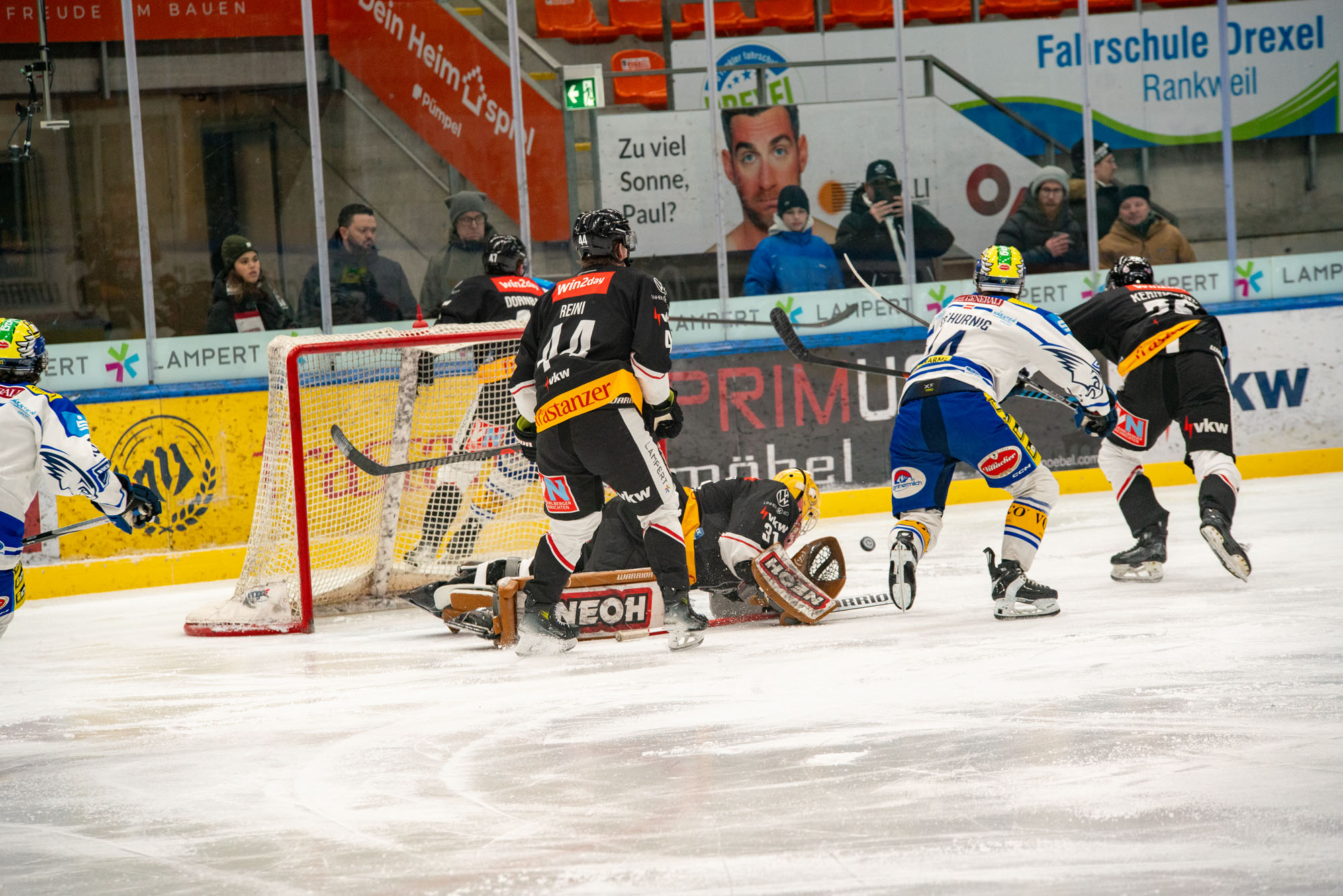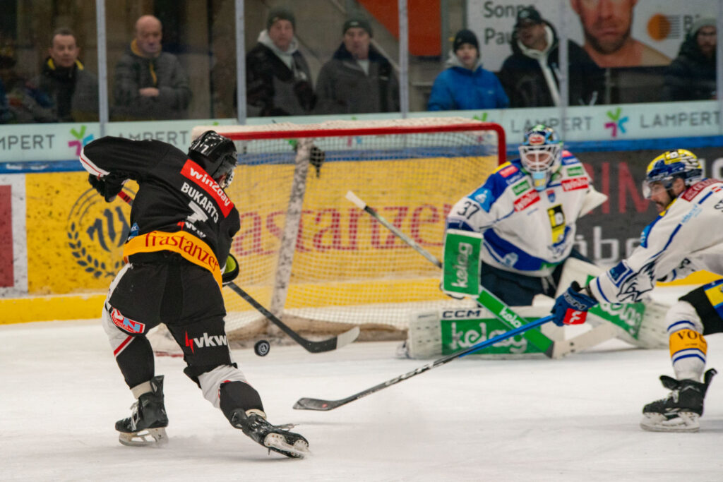 In der zweiten Hälfte des Mitteldrittels fanden die Vorarlberger dann wieder etwas besser in die Partie und kamen zu einigen Abschlüssen. Pech hatte Adams, der den Puck an die Latte hämmerte, zum zweiten Mal an diesem Nachmittag verhinderte die Torumrandung einen Treffer für die Gastgeber.
